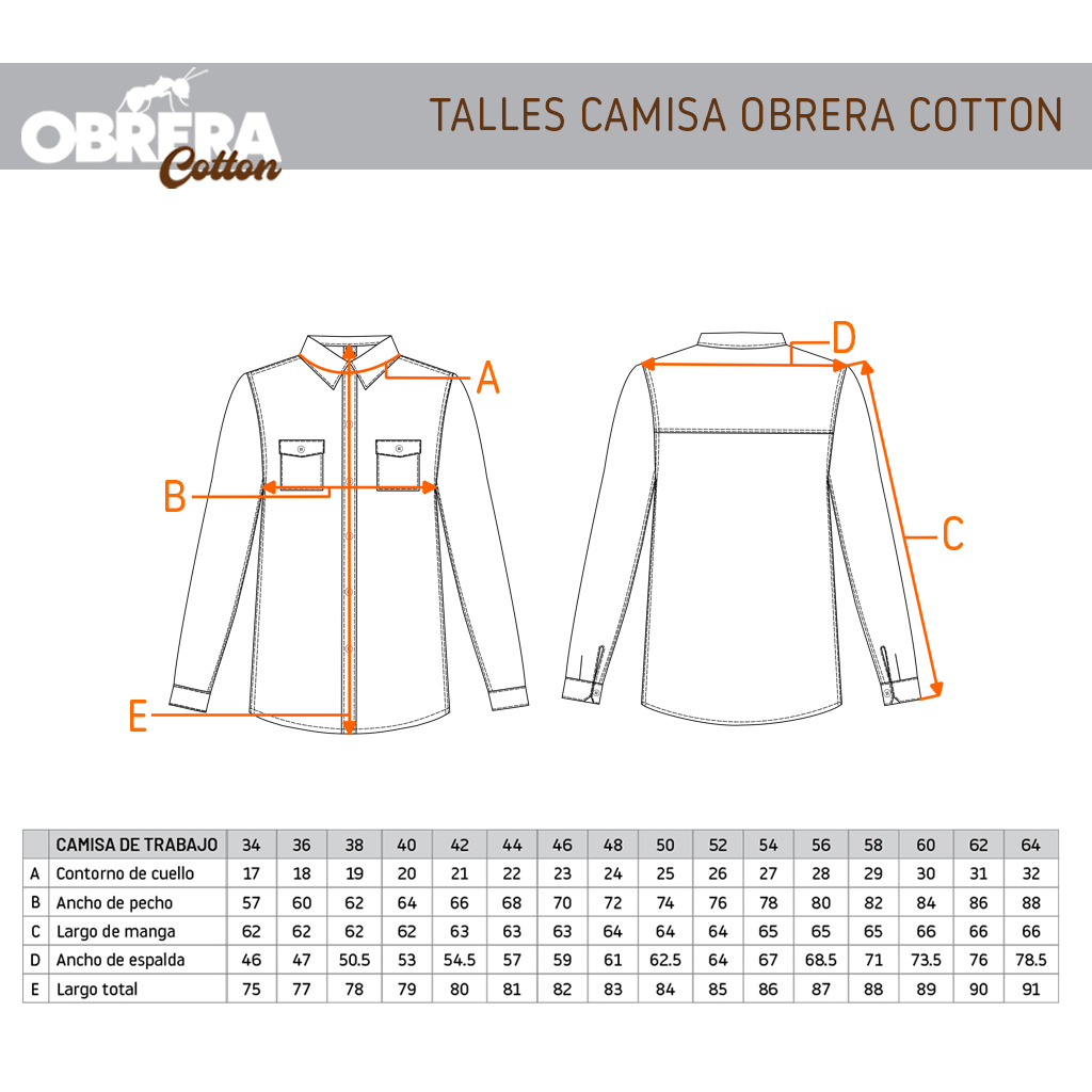 Disponible en talles del 34 al 64, esta camisa se adapta a distintos cuerpos y contextos, manteniendo siempre el carácter de la marca Obrera: trabajo, identidad y calidad.