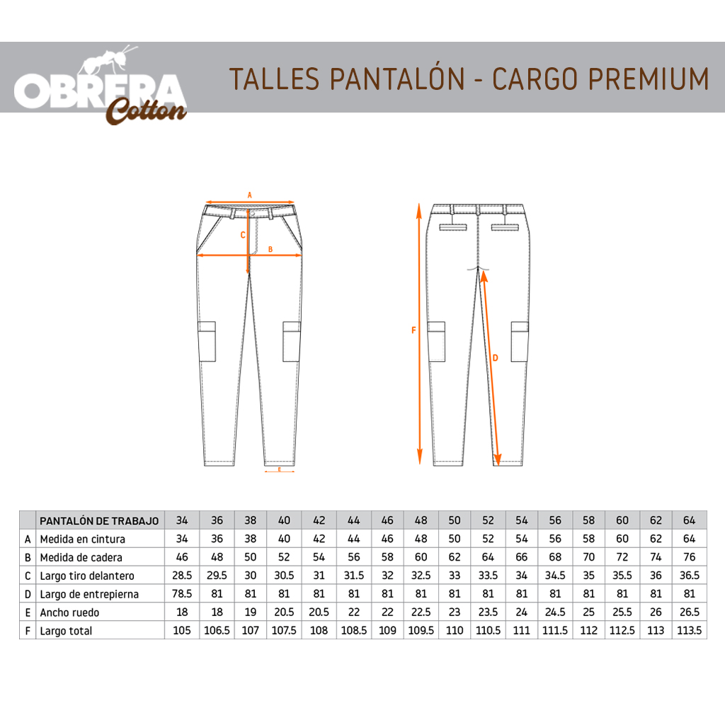 Su estructura incluye dos bolsillos delanteros con fondo de gabardina, dos bolsillos traseros tipo ojal, y un bolsillo cargo lateral con abrojo de 19 x 15 cm, pensado para accesibilidad sin perder estética. El refuerzo de entrepierna, el tiro medio y las costuras reforzadas garantizan comodidad y resistencia en jornadas intensas. Disponible en talles del 34 al 64, este pantalón premium acompaña a quienes construyen con convicción.