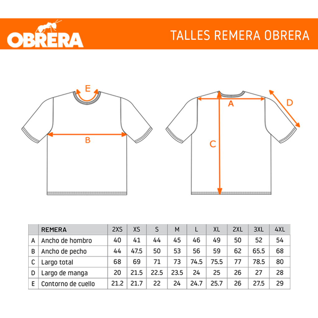 La remera Obrera está confeccionada en 100% algodón, ofreciendo suavidad al tacto y firmeza en el uso diario.